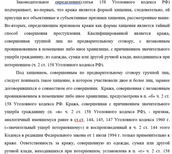 Под хищением, совершенным по предварительному сговору группой лиц, следует понимать такое хищение, в котором участвовали двое и более лиц, заранее договорившихся о совместном его совершении. Кража, совершенная с незаконным проникновением в помещение либо иное хранилище, предусмотрена в п. «б» ч. 2 ст. 158 Уголовного кодекса РФ. Кража, совершенная с причинением значительного ущерба гражданину (п. «в» ч. 2 ст. 158 Уголовного кодекса РФ), — признак, аналогичный имевшемуся ранее в ст.ст. 144, 145, 147 Уголовного кодекса 1960 г. («значительный ущерб потерпевшему») и воспроизведенный в ч. 2 ст. 144 этого Кодекса в редакции Федерального закона от 1 июля 1994 г. только применительно к краже. Ответственность за кражу, совершенную из одежды, сумки или другой ручной клади, находившихся при потерпевшем, установлена в п. «г» ч. 2 ст. 158 Уголовного кодекса РФ.