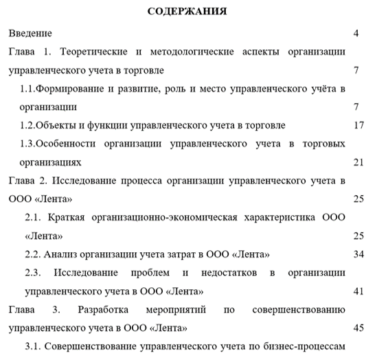 Структура работы представлена тремя главами. Первая глава посвящена определению теоретических и методологических аспектов организации управленческого учета в торговле. Вторая глава состоит в исследовании процесса организации управленческого учета, определению проблем и недостатков в организации управленческого учета в ООО «Лента». Третья глава направлена на разработке мероприятий по совершенствованию управленческого учета в ООО «Лента», а так же оценку их экономической эффективности.