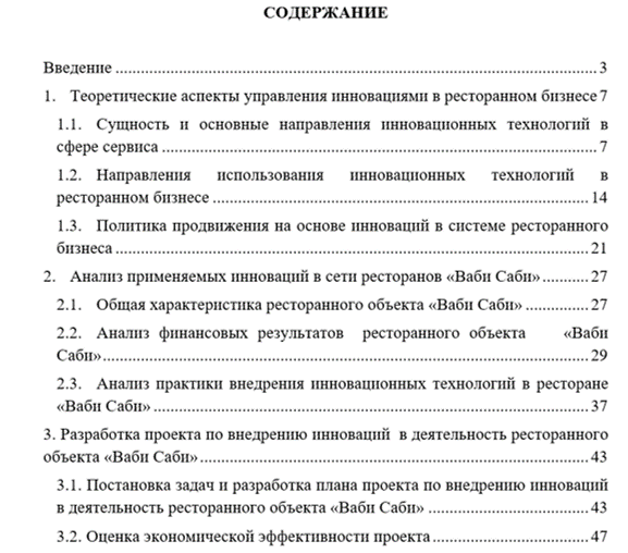 В третьей главе представлена разработка проекта по внедрению инноваций в деятельность ресторанного объекта «Ваби Саби» и оценка его экономической эффективности.