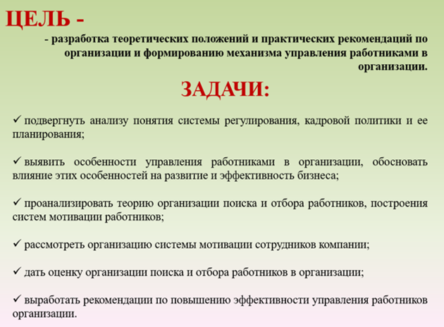 Цель и задачи изучения заключаются в разработке теоретических положений и практических рекомендаций по организации и формированию механизма управления работниками в организации.