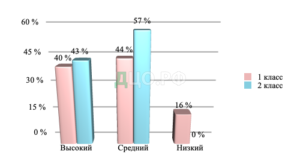 Данные таблицы 2.1 показывают, что у большинства первоклассников выявлен средний уровень самостоятельности – 44%. Во втором классе доля детей со средним уровнем самостоятельности составила 57%, при этом детей с низким уровнем самостоятельности не было выявлено.