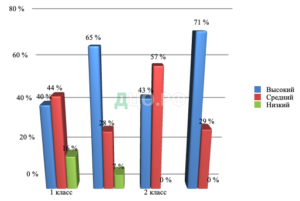 Если выбрать только детей, у которых самооценка совпала с объективной, то получится, что в 1 классе высокая самостоятельность по результатам формирующего эксперимента наблюдается у 65 % ребят, а во втором классе у 71 % ребят, средняя — у 28 %, а в 2 классе — у 29 %. Наконец, в 1 классе только 7 % имеют низкую самостоятельность, а в 2 низкий уровень не был выявлен.