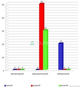 30 % опрошенных отметили преобладание в коллективе демократического стиля управления с высоким уровнем проявления: такие руководители умеют координировать и направлять деятельность всего коллектива, предоставляют возможность самостоятельности более способным работникам, дают им возможность самореализации и самосовершенствования. Руководители с высоким уровнем демократического стиля управления применяют в управленческой деятельности новые методы и приемы работы, в коллективе умеют прислушаться к мнению подчиненных, вовремя оказать моральную и психологическую поддержку, они тактичны, справедливы в разрешении спорных ситуаций, предпочитают предотвращать конфликтные ситуации, чем преодолевать их в дальнейшем, таким образом, руководители обеспечивают эффективное руководство, так как умеют учитывать мнение подчиненных, оказывать поддержку и передавать инициативу и самостоятельность в руки наиболее активных и успешных подчиненных .