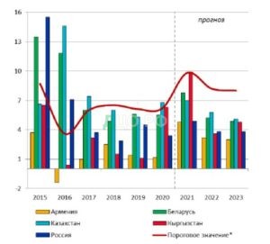 Главной причиной стало существенное общемировое повышение стоимости продовольственных товаров. Под влиянием этого фактора инфляция во всех государствах – членах ЕАЭС остается высокой и в начале 2022 года. Дополнительное давление на цены оказывают вызванные пандемией нарушения в цепочках поставок и дополнительные затраты на противоэпидемические мероприятия. Согласно прогнозам, ожидается, что влияние всех этих факторов на потребительские цены будет постепенно снижаться и в среднем по 2022году темпы прироста индекса потребительских цен в Армении составят 4,8%, в Беларуси – 7,8%, в Казахстане – 7,0%, в Кыргызстане – 9,9%, в России – 4,9%.
