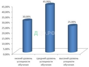 В результате анализа учебной документации учащихся 3 «А» класса, 6 учеников, что составляет 30,0 % от общего числа детей относятся к низкому уровню успешности обучения; 9 учащихся, что составляет 45,0 % от общего числа детей, относятся к среднему уровню успешности обучения; 5 детей, что составляет 25,0 %, показали высокий уровень успешности обучения.