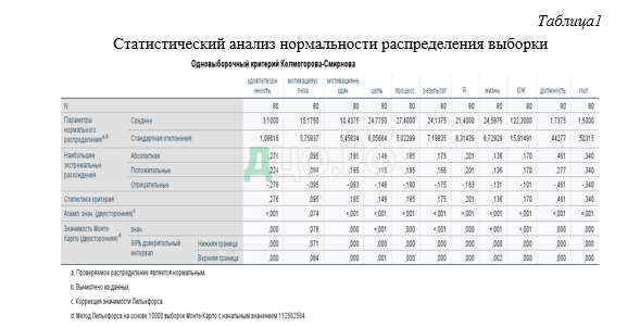 Проверка выборки на нормальность распределения по критерию Колмогорова-Смирнова показала следующие результаты (Таблица 1):