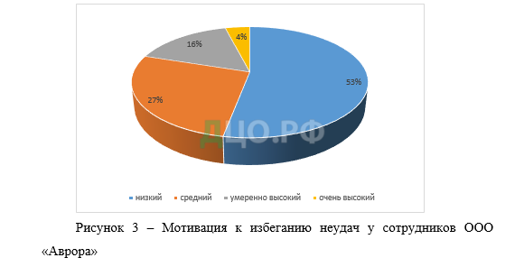 Соответственно, мотивация избегания неудач присуща 16% сотрудников, к тому же у 4% — очень высокий уровень данной мотивации. Низкий уровень выражен у 53% сотрудников (в том числе – у всех руководителей). Средний уровень проявлен у 27% работников предприятия (Рис. 3).