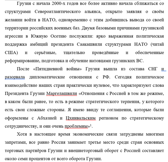 И последнее государство Южного Кавказа — Грузия. С данной страной у нас самые сложные отношения, даже перераставшие в вооружённый конфликт. Хотя Россия принимала активное участие в переговорах по урегулированию вооружённых конфликтов в Абхазии и Южной Осетии с самого их начала и даже способствовала их прекращению их «горячей фазы», Грузия не прекратила своих попыток установить свой контроль над данными территориями, что, в конце концов, и привело к российско-грузинскому столкновению.